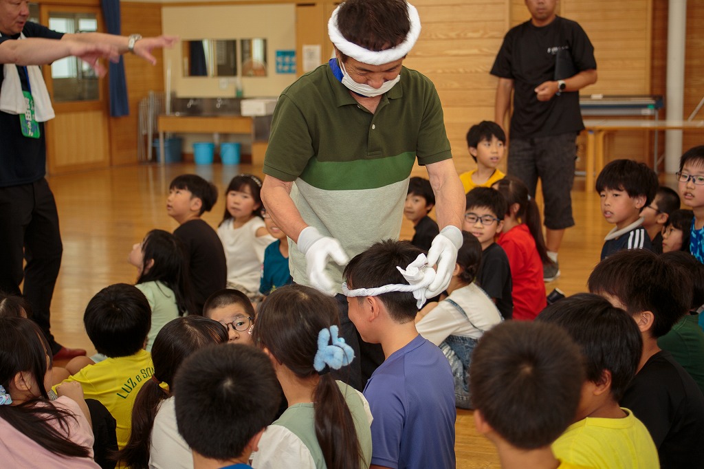 授業前、持参した手ぬぐいで数名の生徒にねじり鉢巻きをつけると周りからは羨望の声が