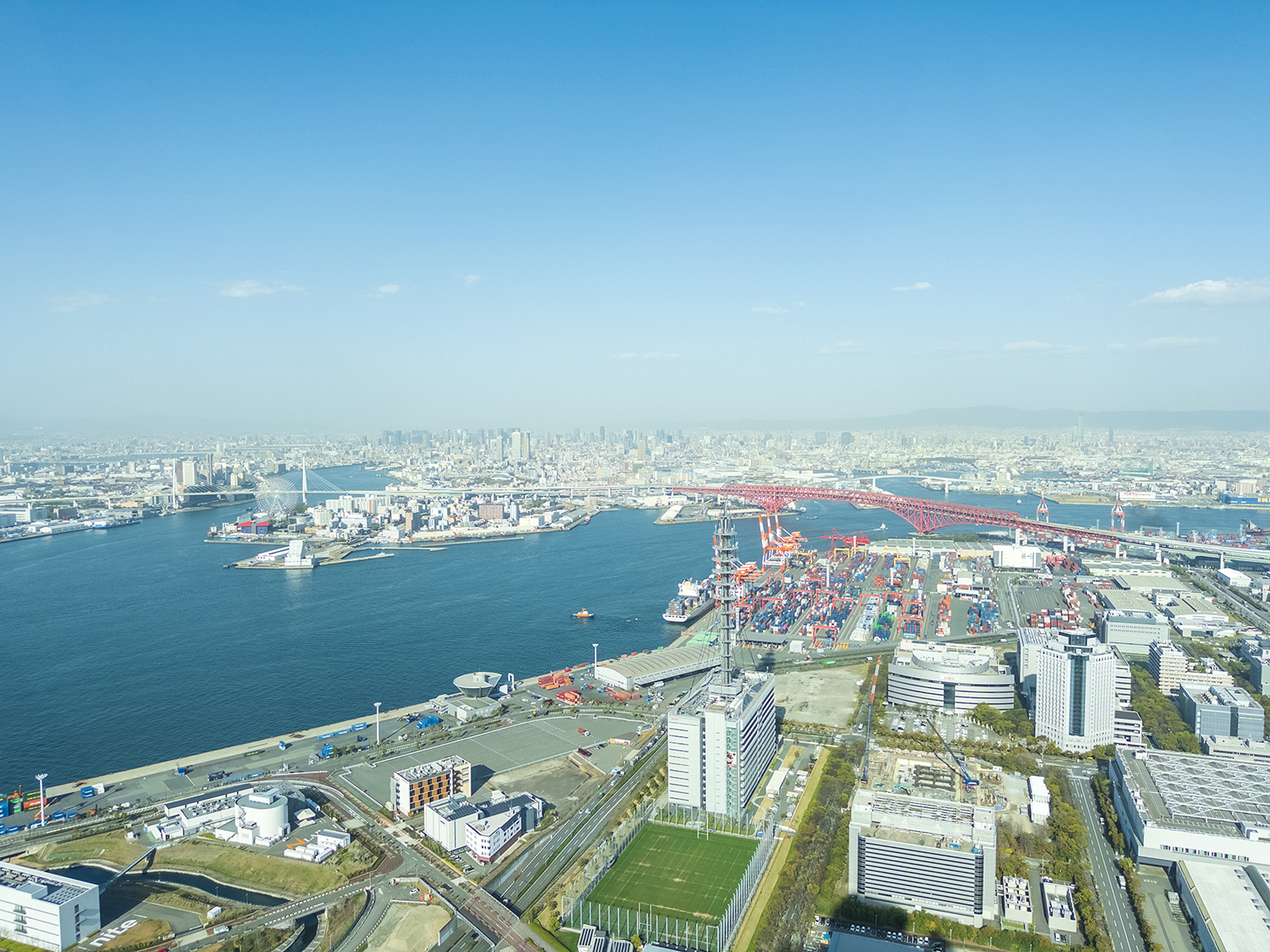 かつては蝦夷地からのこんぶが大量に入った大阪港。現在の大阪ベイエリアの姿。ランドマークは赤い港大橋