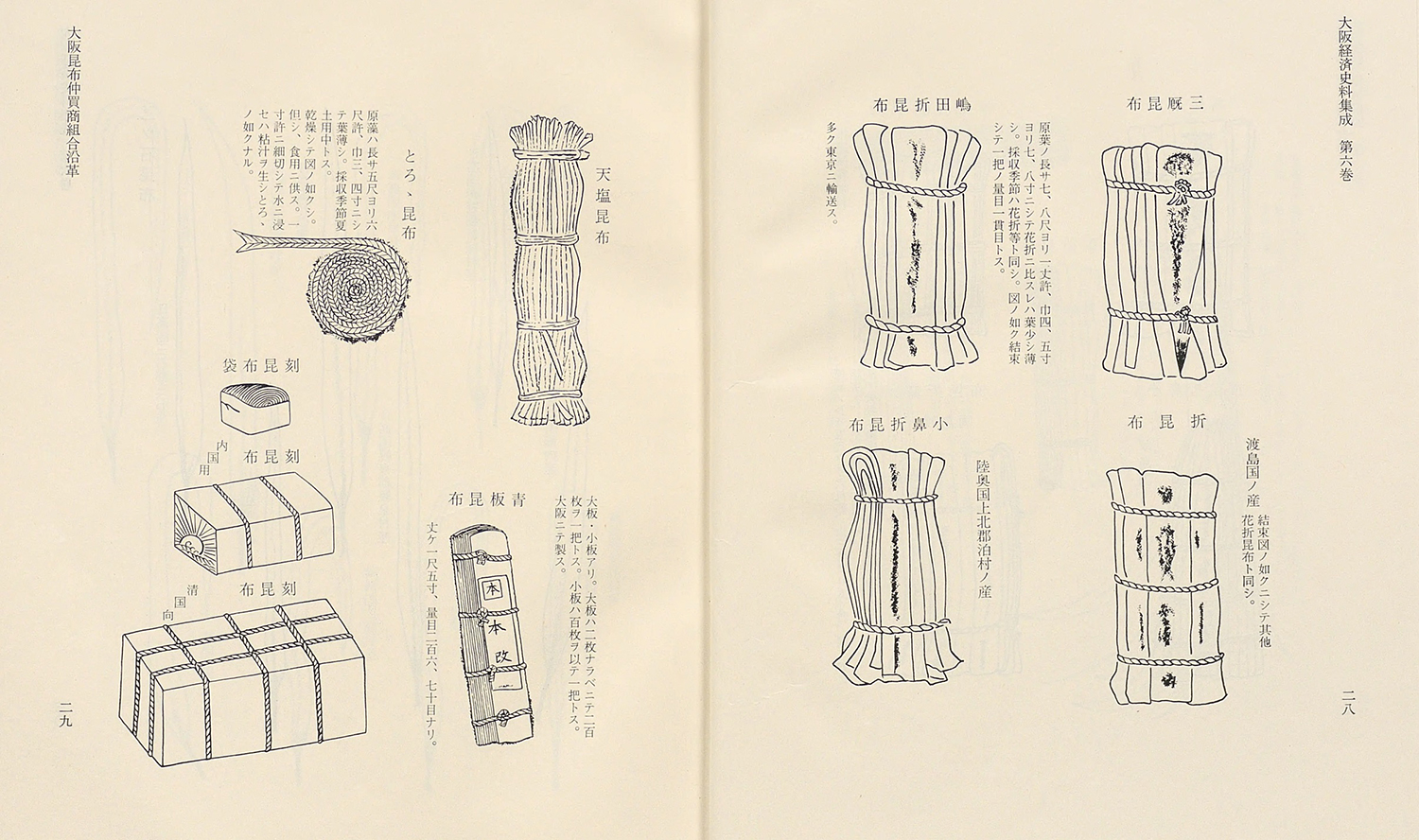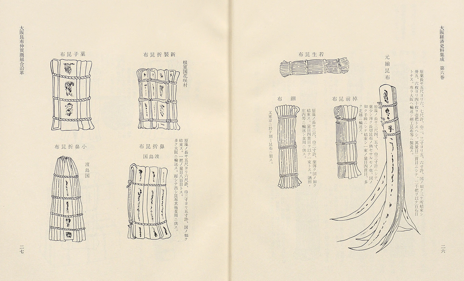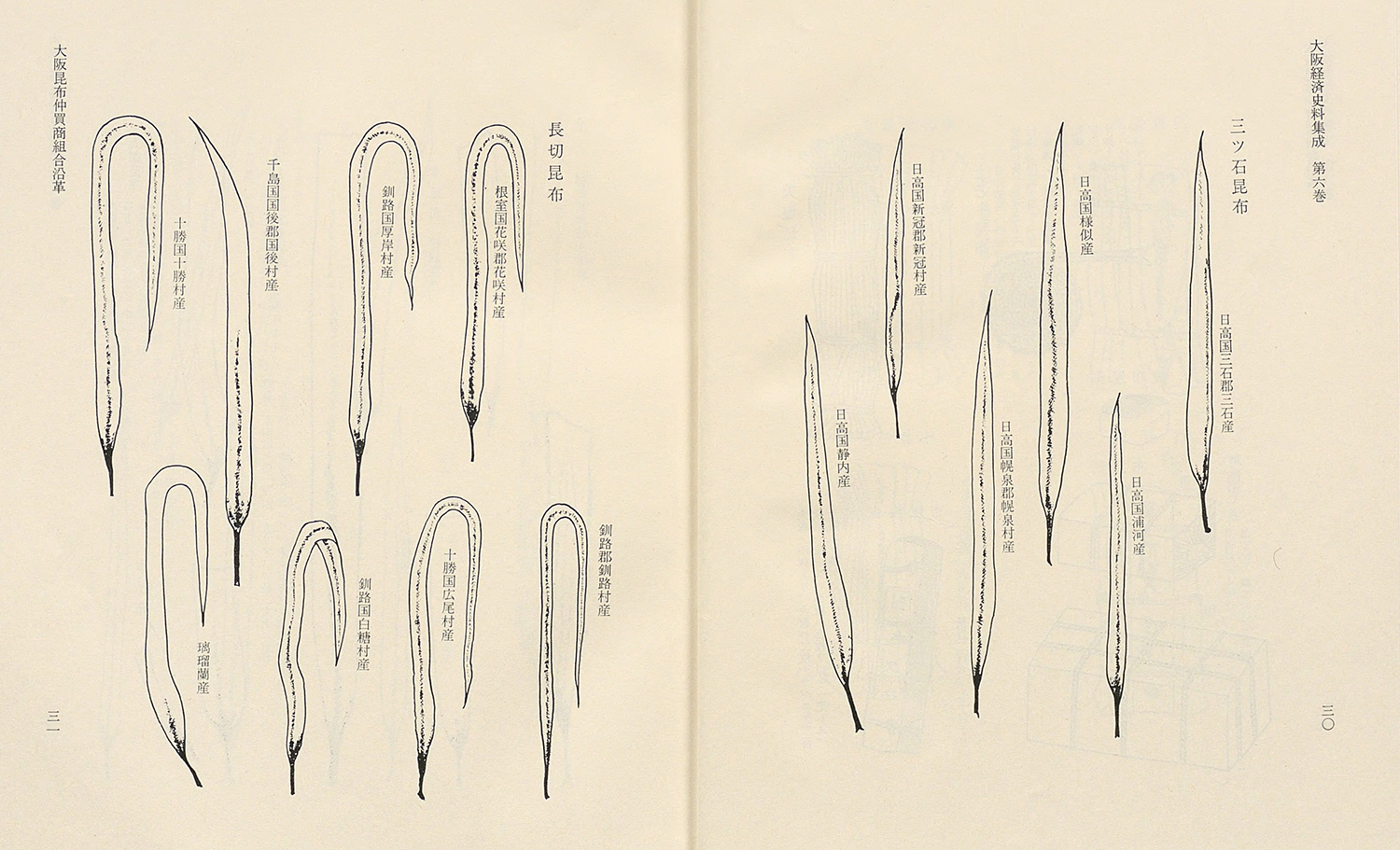 「六十五年のあゆみ」では、元文元(1736)年に大阪に入った昆布(選別・加工された製品)の量は、70貫934匁 (約266kg)、荒昆布(未加工・粗加工の昆布)が28貫970匁 (約109kg)とある。この元文年間(1736-1741)は、大阪が昆布流通の中心地としていよいよ扱いを拡張していく時期だ。専門の仲買と問屋が整ってきたのは宝暦・明和(1751-1772)のころで、続く時代(安永・天明期)には、昆布問屋と加工業者の顔ぶれも分厚くなってきていた。