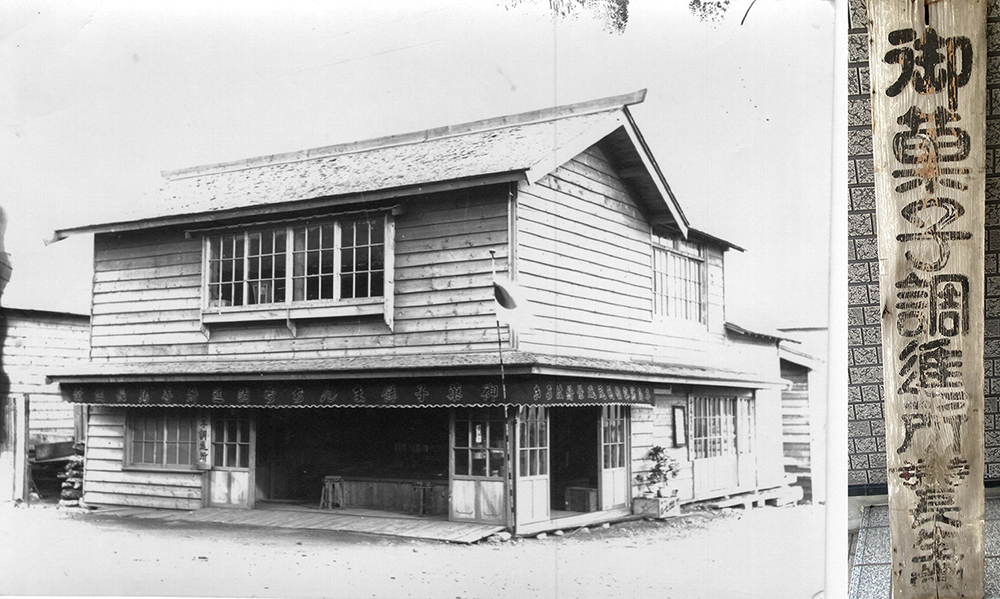 1923年(大正12年)頃建立の寺嶋菓子舗と看板「御菓子調進所寺嶋長生堂」