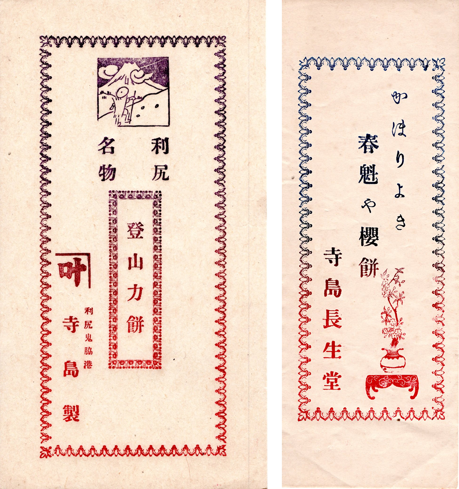 こうしたことがわかる資料がある。一つは「利尻名物登山力餅」に巻くミニ帯だと思われる。この登山力餅っていうのは、1923(大正12)年5月に小樽新聞社が創刊満30年、累号1万に達することを記念して北海道三景を募集し利尻富士が見事一位となったので、翌年12月に鬼脇にある北見神社境内に「北海道三景之碑」が建てられ、1930(昭和5)年7月にそれを記念する利尻登山が小樽新聞社、北日本汽船株式会社主催で行われた。490名が小樽から船に乗り鬼脇港について、約200名が鬼脇登山道から利尻山に登った。登山する人たちの体力維持のために「力餅」を作ったようだ。もう一つは3月の雛祭りにあわせて作る「桜餅」。これのミニ帯に俳句「かほりよき春魁や櫻餅」を表している。鬼脇は明治時代から俳句が盛んで、鬼脇の日蓮宗妙泰寺や北見神社社務所には明治40年代の句額が奉納されている。ただ、和菓子を作って売るだけでなく、そこに四季の風物をからませて、食べることの楽しさ、面白さに工夫をこらしたのだろう。