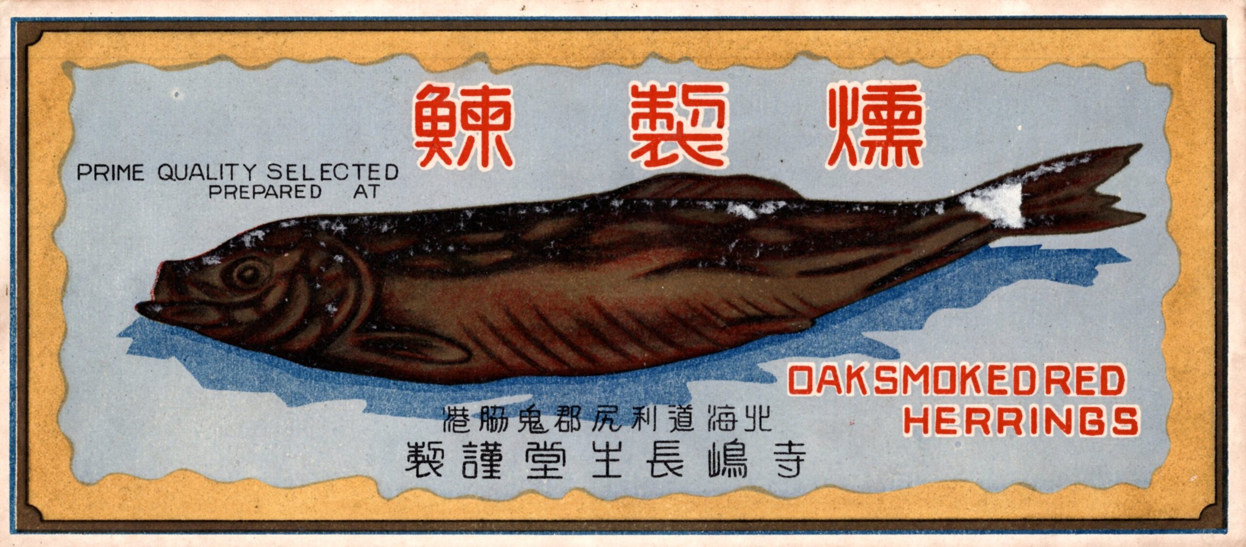 さらに島の漁業の根幹である鰊を燻製にしたラベルがある。明治末から大正初期は利尻島で鰊大豊漁が続いたので、獲れた鰊を数の子、身欠き鰊、鰊粕とは全く別な「燻製鰊」を作って売るという。明治末期から大正初期にかけて利尻島の鰊漁獲高は大豊漁だったからか、寺嶋長生堂は「燻製鰊」を作った。宣伝として英語で「厳選された高品質 オーク燻製赤鰊」と書かれている。英語が今ほど身近でない時代においてなぜ英語を使うのか、さらに、鰊の燻製を製造して売ることの発案と実際にどれぐらい売れたのだろうかが気になることだ。