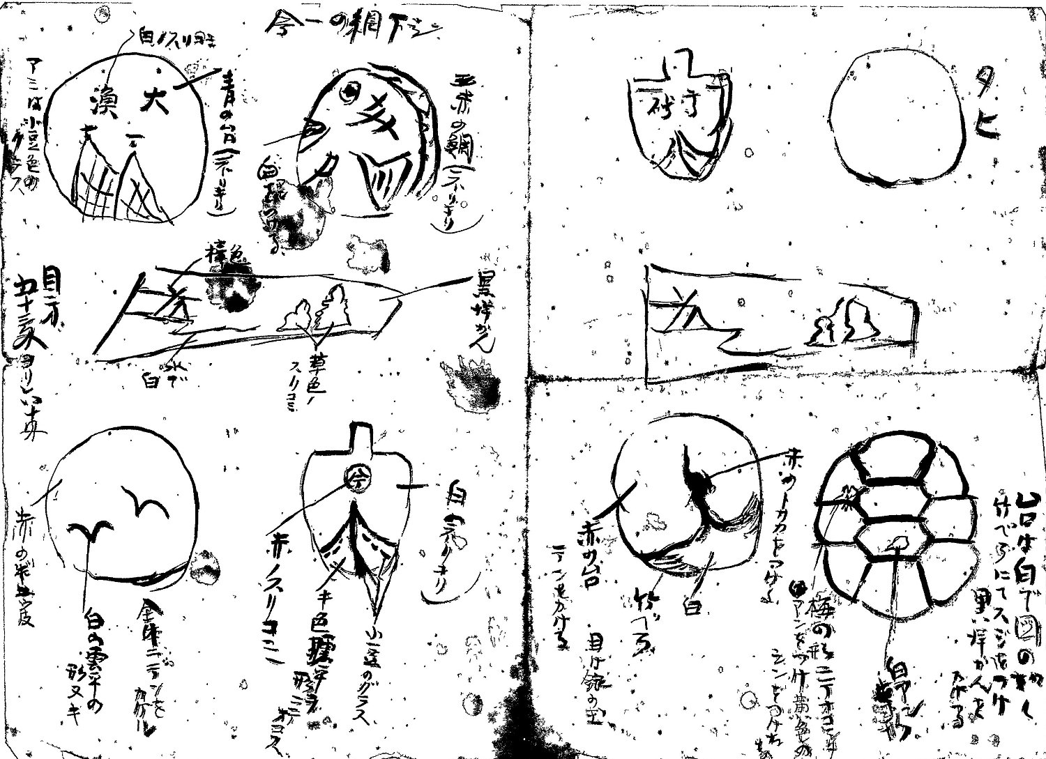 1923年(大正12年)頃に新しく建てたと思われる店の写真がある。一階の下屋根の下にかかっている横幕には「御菓子餅まんぢう調進所寺嶋菓子舗」と「寺嶋写真屋風景絵はがき」がある。三代目寺嶋豊次郎時代の店の写真だ。横幕から餅と饅頭などの和菓子を作って売ってたんだろう。その横幕に上の部分が隠れているが「御菓子調進所」という看板が見える。「調進所」とは「特定の品物を専門的に調達・製造し、品物を納めている老舗の屋号として使われ、格式高い菓子の店」を意味するようだ。もしかしたら、長生堂寺嶋菓子舗が、村役場や学校、神社やお寺などの年中行事に和菓子を収めていたことや、鰊場の網おろしに使う祝い物として島の年中行事にあわせて和菓子を作っていたのかもしれない。寺嶋菓子舗には和菓子の木型がかなり多く残っているが、三代目の豊次郎の時にたくさん仕入れたようだ。役場や学校、神社、お寺などや島の人たちの生活の仕来りに要する多様な和菓子を作るためだったと思う。例えば祝い事などで使う和菓子の鯛の木型は小さい物で一尺二寸(約30㌢)、大きい物で一尺五寸(約45㌢)などがある。海老の木型がありその後ろ側には「青森市元木商店」と刻まれている。さらにこの時代のものと思われるが、和菓子の「練り切り」図面が残されている(冒頭の写真)。凄く手の込んだ上生菓子「練り切り」を作っていたのだろう。味・形・色に思いのある物を作ろうという気持ちが込められているのかもしれない。