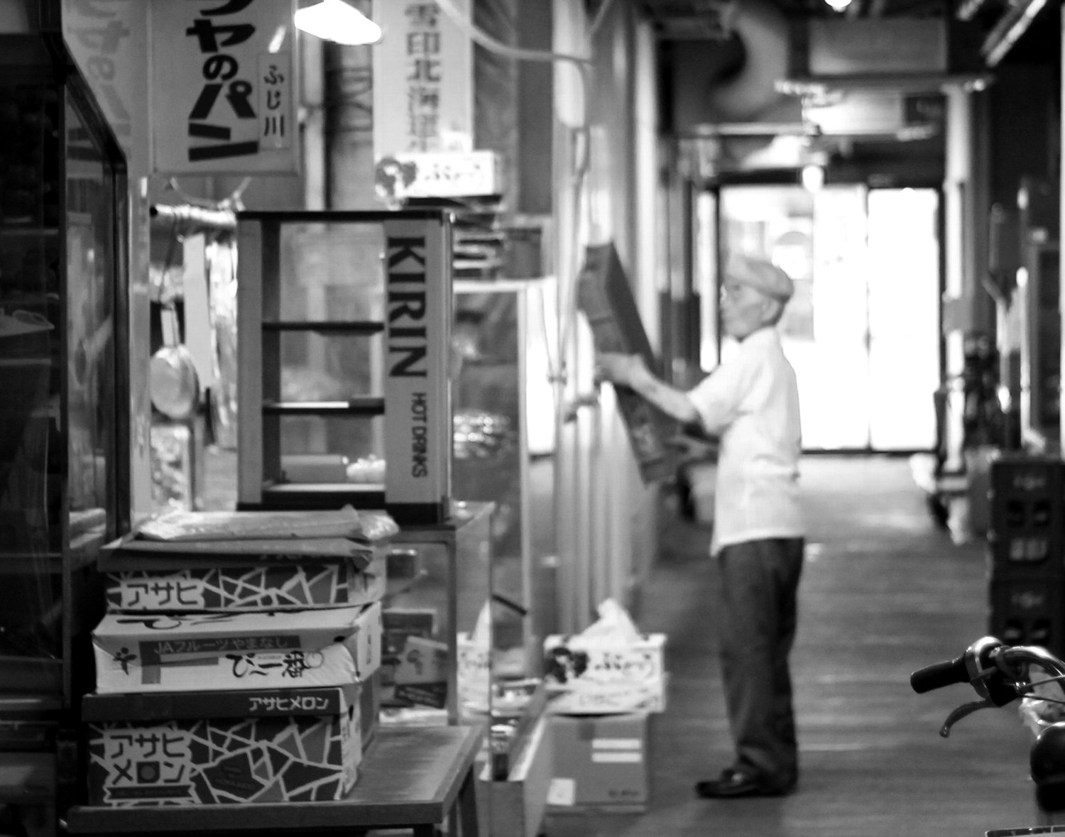 「開店当時は市場の前に“新川”が流れていて、市場もそれに沿うように建っていました。(中略)建物も当時としては実に立派でね。今じゃすっかりくたびれましたが、私たちの商売は、建物の見栄えじゃなく、いかにお客様に喜んでもらえるかが勝負ですから。(中略)この市場には何ともいえない味があるね。お客さんも気さくで、おおらかだから、商いもしやすいし。ここは自分の“死に場所”だね」